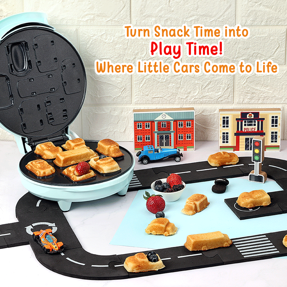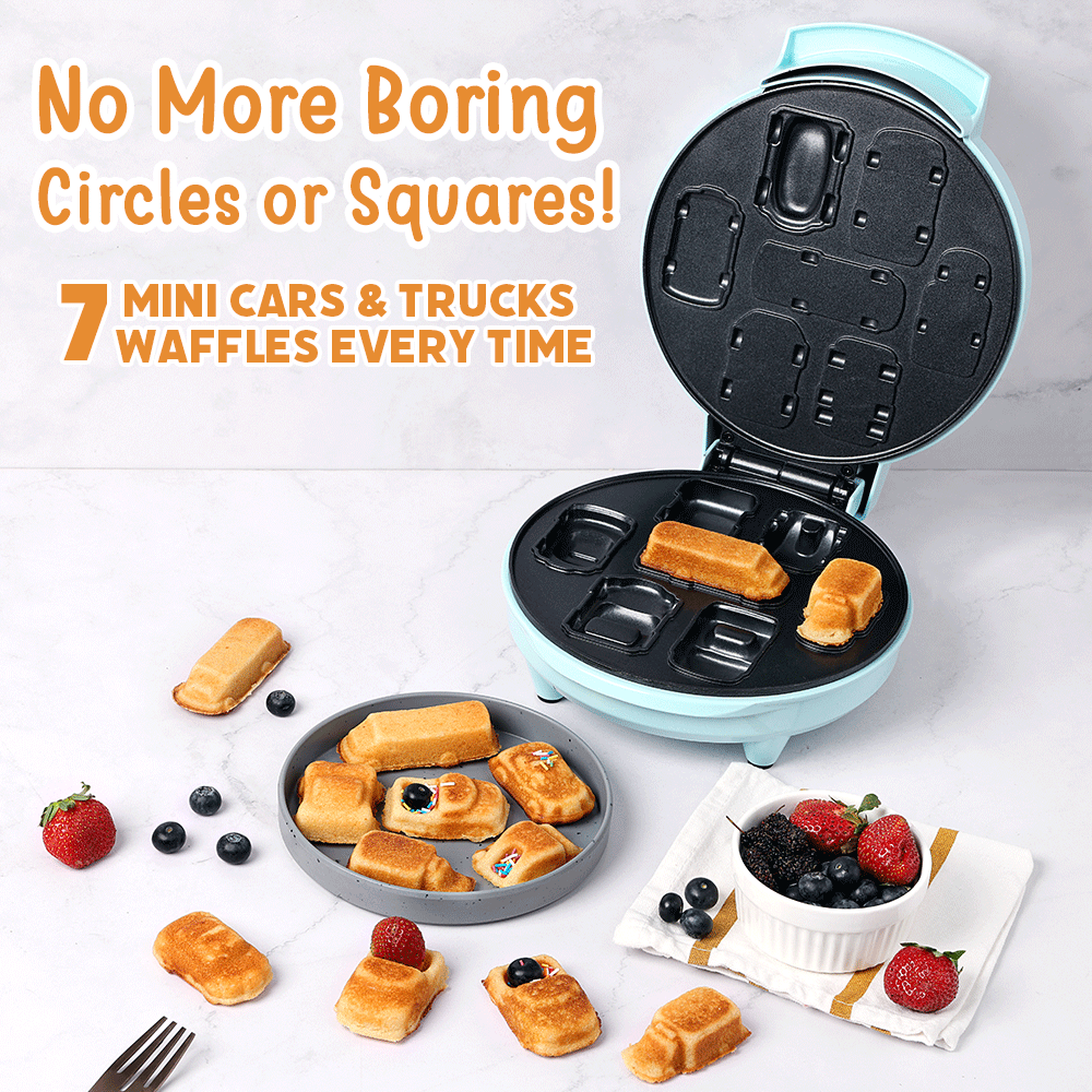 MAKES 7 MINI CAR & TRUCK WAFFLES: Bring smiles and giggles to the breakfast table with this fun waffle maker. Each batch makes 7 high-quality adorable car & truck impressions: Race Car, Police car, Monster Truck, Mini-Truck, Ambulance, School Bus, & Garbage Van. Kids love the cool vehicle shapes and fun dipping size!