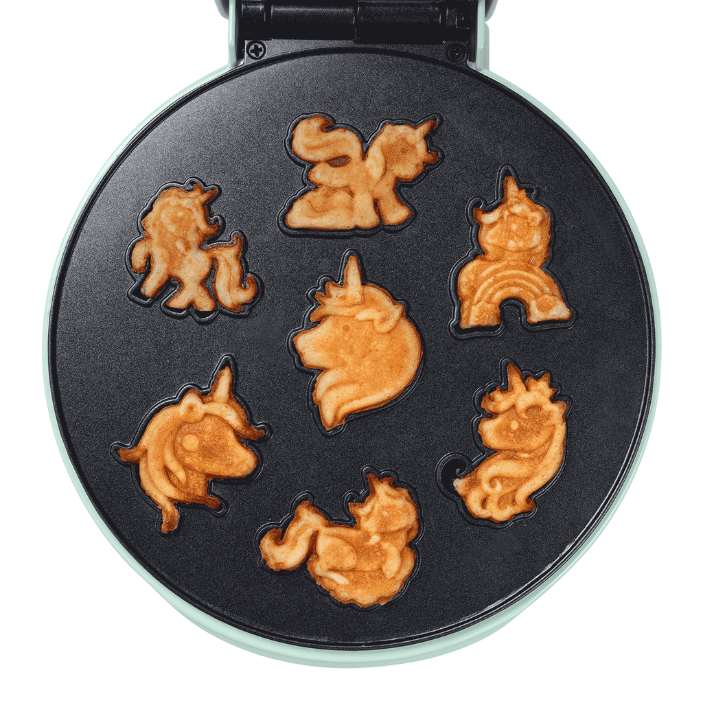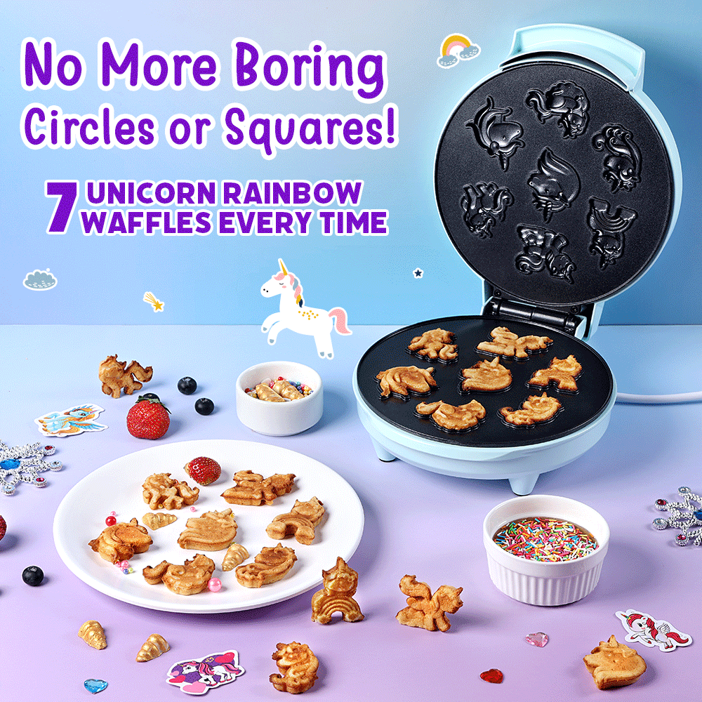 MAKES 7-MINI UNICORN RAINBOW WAFFLES: Bring smiles and sparkle to every bite with this magical waffle maker. Each batch makes 7 high-quality adorable Unicorn impressions: Rainbow, Fluffy Cloud, Princess, Pixie, Sunshine Sparkle, Dreamer & Sugar Blossom Unicorns. Kids love the cute unicorn shapes and fun dipping size!
